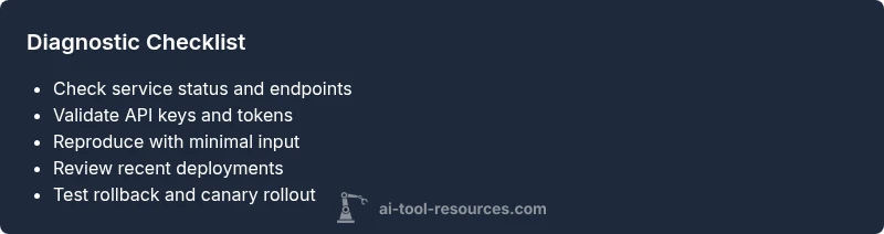 Facing a broken ai tool in production? Start with the easiest checks: confirm service status, verify credentials, and test a simple request. If the issue persists, inspect recent changes, dependencies, and rate limits. This guide from AI Tool Resources outlines a clear, step-by-step diagnostic path to restore service and prevent recurrence.