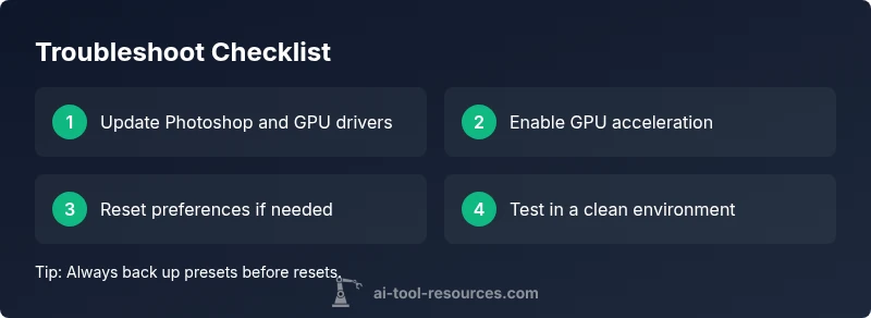 According to AI Tool Resources, many users encounter AI tool issues in Photoshop due to a mix of configuration, compatibility, and resource allocation. In 2026, the pattern remains consistent: non-trivial failures usually stem from misconfigured settings, outdated software, or hardware bottlenecks rather than a single bug in the AI engine itself. This article, grounded in practical troubleshooting, helps you isolate root causes quickly and restore productivity with minimal risk. You’ll learn to distinguish between simple, user-facing problems and deeper compatibility challenges that require a more thorough fix.