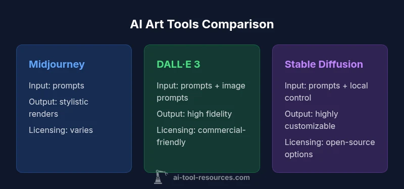 Choosing the right AI art tool matters because it shapes the creative direction, output style, and how you can monetize or publish your work. The choice affects input requirements, iteration speed, licensing terms, and technical accessibility. According to AI Tool Resources, the optimal tool for a given project aligns with your workflow, the desired level of control, and your rights to commercial use. For researchers, developers, and students exploring AI tools, understanding these dimensions avoids wasted time and unexpected restrictions. In practice, you’ll weigh model capabilities, prompt engineering surfaces, and integration with your existing toolchain. The landscape includes cloud-based services and local-model options, each with distinct trade-offs for image fidelity, latency, and customization potential. By mapping your needs to these factors, you’ll minimize risk and maximize creative output.