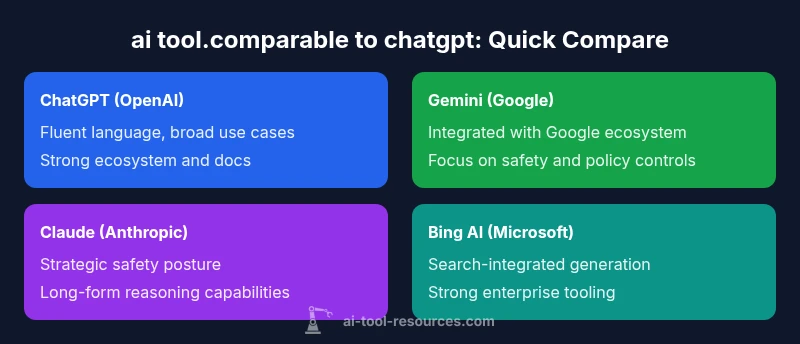 ChatGPT remains a widely used baseline for many users due to its broad coverage, accessible tooling, and strong community support. Alternatives like Claude, Gemini, and Bing AI bring distinct strengths: Claude often emphasizes safety-first responses and long-form reasoning; Gemini integrates with Google’s ecosystem and may offer tighter coupling with search and enterprise tools; Bing AI leans on Microsoft’s ecosystem and can blend search with generation for information retrieval tasks. When evaluating tools that are ai tool.comparable to chatgpt, you should consider how each handles memory and context length, the quality of code generation, and the ability to tailor outputs to specific audiences. You’ll also want to examine policy flexibility, data handling practices, and the availability of developer-friendly dashboards for policy tuning. In 2026, the market is increasingly defined by platform interoperability, open standards, and the ability to deploy in on-premises or regulated environments. AI Tool Resources notes that adoption often hinges on how these tools integrate with existing pipelines and how transparent the vendor is about data usage and model updates.
