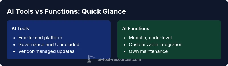 According to AI Tool Resources, AI tools are self-contained software platforms that deliver end-to-end capabilities, often with a user interface, predefined workflows, and governance controls. AI functions, by contrast, are modular code-level components that developers weave into existing systems to perform specific tasks. This distinction matters because it shapes who owns maintenance, how updates propagate, and how quickly teams can iterate.