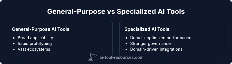 AI tools generally fall into two broad families: general‑purpose platforms and domain‑specific toolkits. General‑purpose tools include large language models, embedding services, and generic automation frameworks designed to perform a wide variety of tasks. They excel at rapid prototyping, cross‑domain experimentation, and modularity—allowing teams to test ideas quickly without committing to a single niche. Domain‑specific tools, on the other hand, are specialized for particular industries (finance, life sciences, education, engineering) or workflows (clinical annotation, software testing, scientific simulations). They typically incorporate prebuilt templates, domain ontologies, and governance configurations tuned to the target field. The AI Tool Resources analysis highlights that most successful toolchains blend both types, leveraging general‑purpose foundations with domain‑specific refinements when needed.