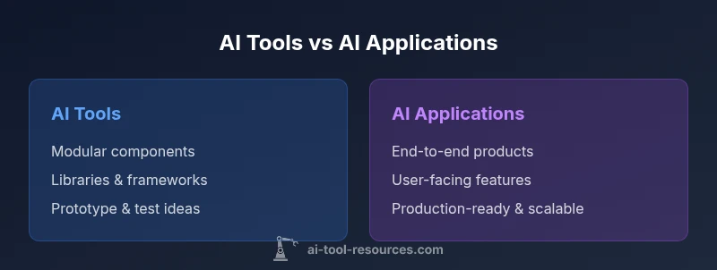 The difference between ai tools and ai applications becomes most obvious when you separate building blocks from end-user products. AI tools are modular resources—libraries, frameworks, APIs, and platforms—that empower developers and researchers to implement AI capabilities. They include model hubs, data processing pipelines, feature extractors, and orchestration services. AI applications, by contrast, are end-to-end software solutions that deliver concrete outcomes to users, such as conversational agents, image editors, or decision-support dashboards. According to AI Tool Resources, successful AI initiatives typically start by selecting the right mix of tools, then package them into cohesive applications that meet user needs and business goals. This distinction guides how teams plan, fund, and govern AI work, from experimentation to production.