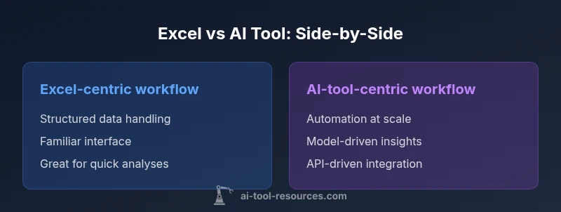 In 2026, many teams rely on a mix of spreadsheet-based workflows and AI-powered automation. The phrase excel vs ai tool captures a spectrum: Excel is a familiar, grid-based environment optimized for tabular data, while AI tools offer programmability, model-driven insights, and scalable automation. According to AI Tool Resources, the most effective organizations don’t pick one over the other; they orchestrate both to meet different stages of data work. This article analyzes the tradeoffs, enumerates decision criteria, and provides practical guidance for developers, researchers, and students exploring AI tools. The goal is to help you map your use cases to the best-fitting tool, or to a thoughtful hybrid pipeline that leverages their respective strengths.