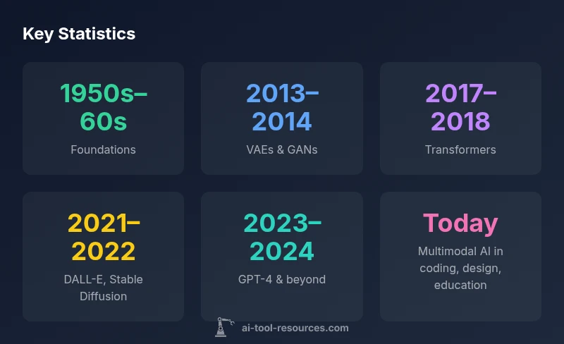 Explore the origins and milestones of generative AI tools from early probabilistic models to diffusion-era tools, with a clear timeline and implications for developers.