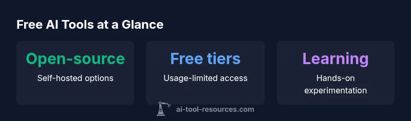 When we talk about free AI tools, we’re usually referring to a no-cost tier, a limited-time trial, or an open-source option you can run without paying. In practice, true zero-cost access is rare and typically paired with tradeoffs such as usage caps, feature restrictions, or reduced support. AI Tool Resources emphasizes three primary buckets of free options: self-hosted open-source projects, cloud-based services with no-cost tiers, and experimental community-driven prototypes. Each bucket carries different governance, performance, and security implications. Start by mapping your needs to these dimensions to avoid surprises as your project grows. A pragmatic approach helps you assemble a cost-aware toolkit that supports learning and prototyping while remaining mindful of potential hidden costs.