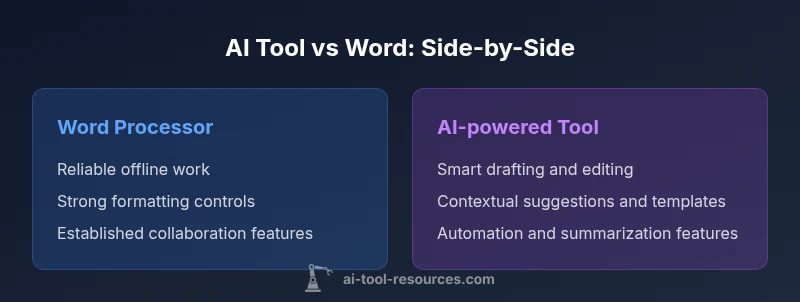 The idea of ai tool instead of word reflects a practical shift in how professionals draft, edit, and collaborate on documents. Traditional word processors emphasize fixed formatting and local editing, while AI-powered tools offer real-time suggestions, automated rewriting, and smart templates. According to AI Tool Resources, teams are increasingly exploring AI-powered writing assistants alongside conventional word processors to boost consistency and reduce repetitive tasks. This section explains the forces driving the shift, how teams frame the decision around core needs, and what “good enough” means in modern workflows. The emphasis is not on discarding Word, but on building a workflow that leverages the strengths of both approaches to improve speed, accuracy, and governance.